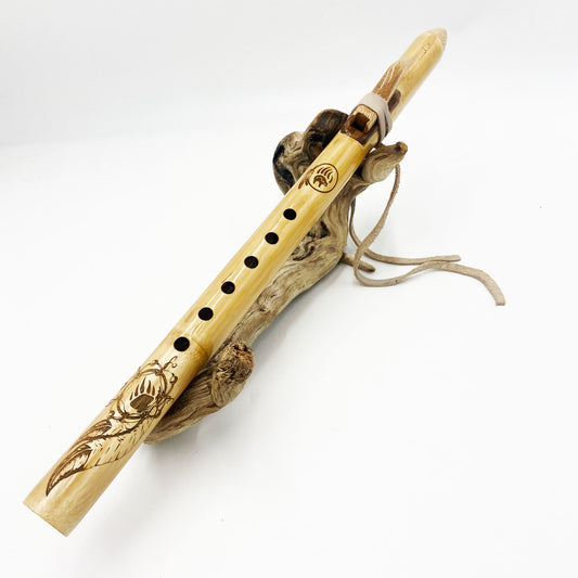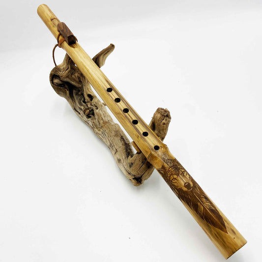 Flûte Amérindienne en Bambou – Fa (F) 432Hz – Gravure Loup & Totem en Noyer